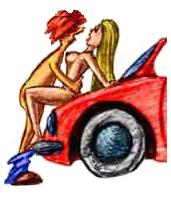 女性はボンネットにすわり、両脚を開き、男性はその間に立つ。