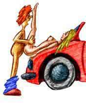 女性はボンネットに上半身を寝かせ、男性は彼女の両腿の間に立つ。