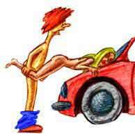 女性は上半身をボンネットに乗せ男性は女性の脚を開きながら持ち上げ、挿入開始。
